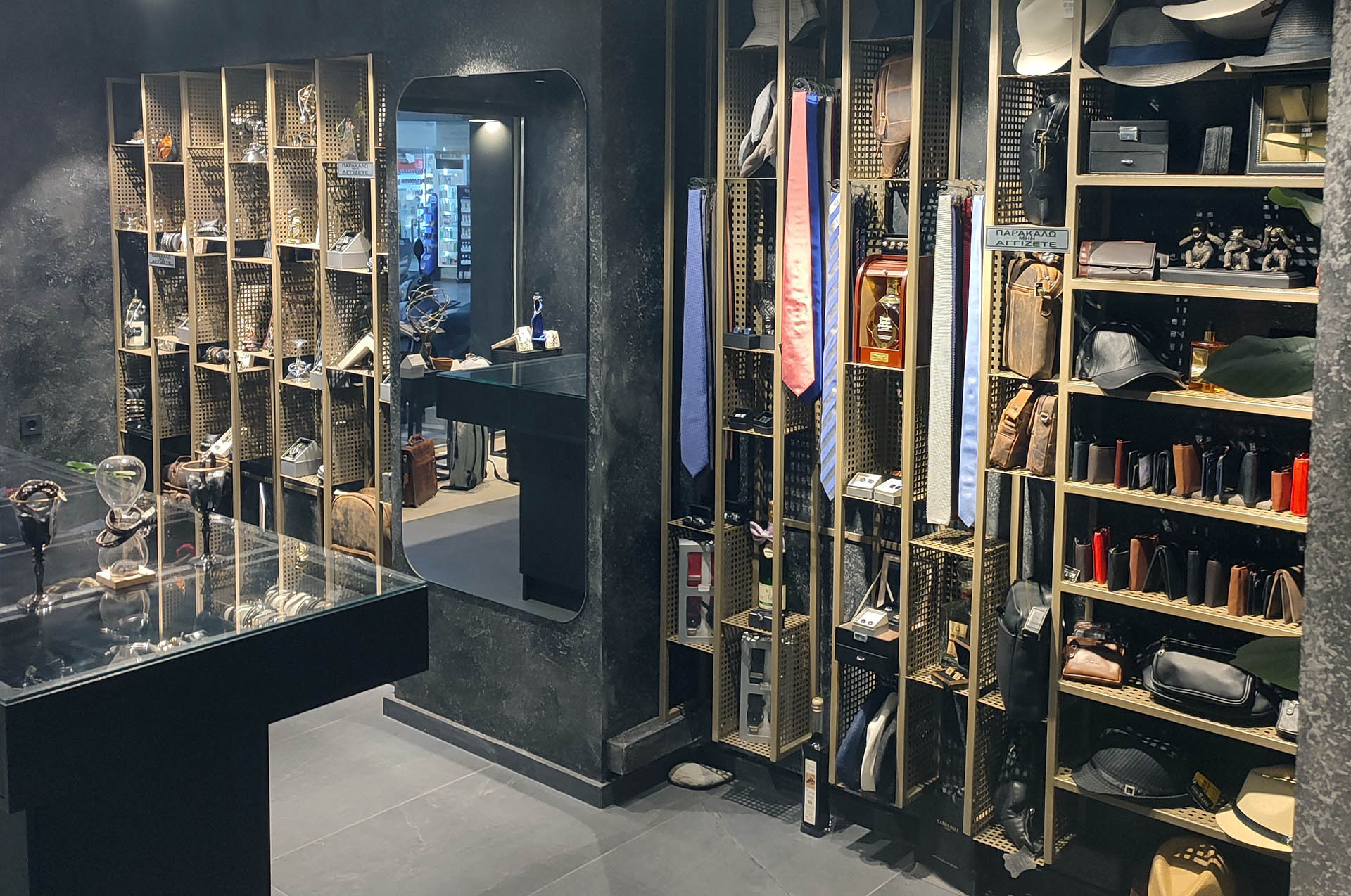 Εδώ θα βρείτε ανδρικά αξεσουάρ. Αξεσουάρ για μας σημαίνει ότι μπορεί να φορέσει ένας άνδρας, εκτός από ρούχα και παπούτσια. Κοσμήματα, ρολόγια, δερμάτινες ζώνες, πορτοφόλια, καρτοθήκες, τσάντες, καπέλα, κασκόλ, μαντίλια, γραβάτες, παπιγιόν, κλιπ, αλυσίδες γραβάτας και γιλέκου, κάλτσες, μανικετόκουμπα, φροντίδα για τα γένια, αρώματα, γυαλιά ηλίου κλπ. Επίσης, έχουμε εμπλουτίσει την συλλογή μας με είδη δώρων και διακοσμητικά για ξεχωριστές επιλογές. Βασική μας επιδίωξη είναι να γίνουμε πηγή έμπνευσης για κάθε άνδρα!