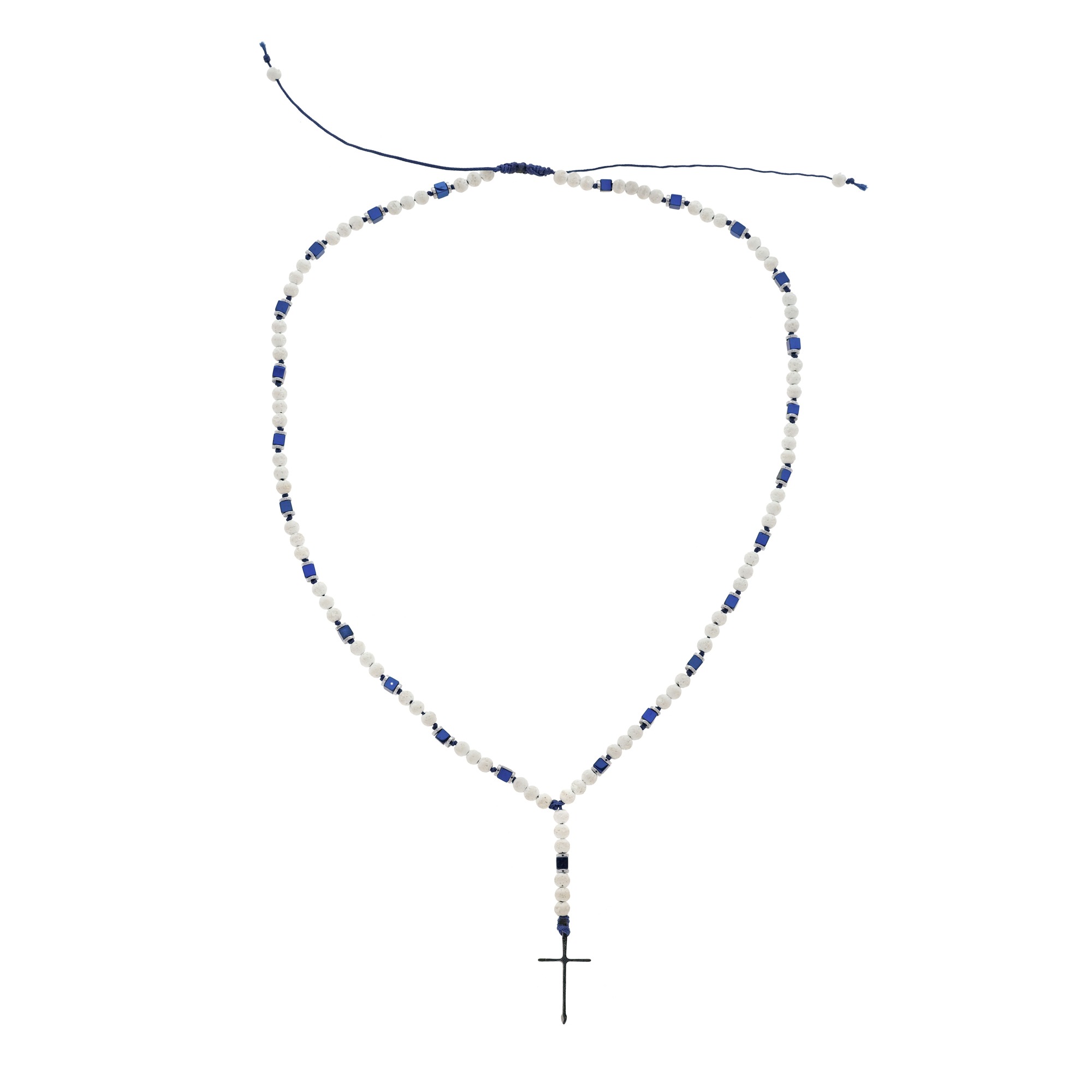Ανδρικό χειροποίητο ροζάριο με ημιπολύτιμους λίθους από λάβα λευκή(4mm) και αιματίτη τετράγωνο μπλε(4mm) και ροδέλα(4mm).