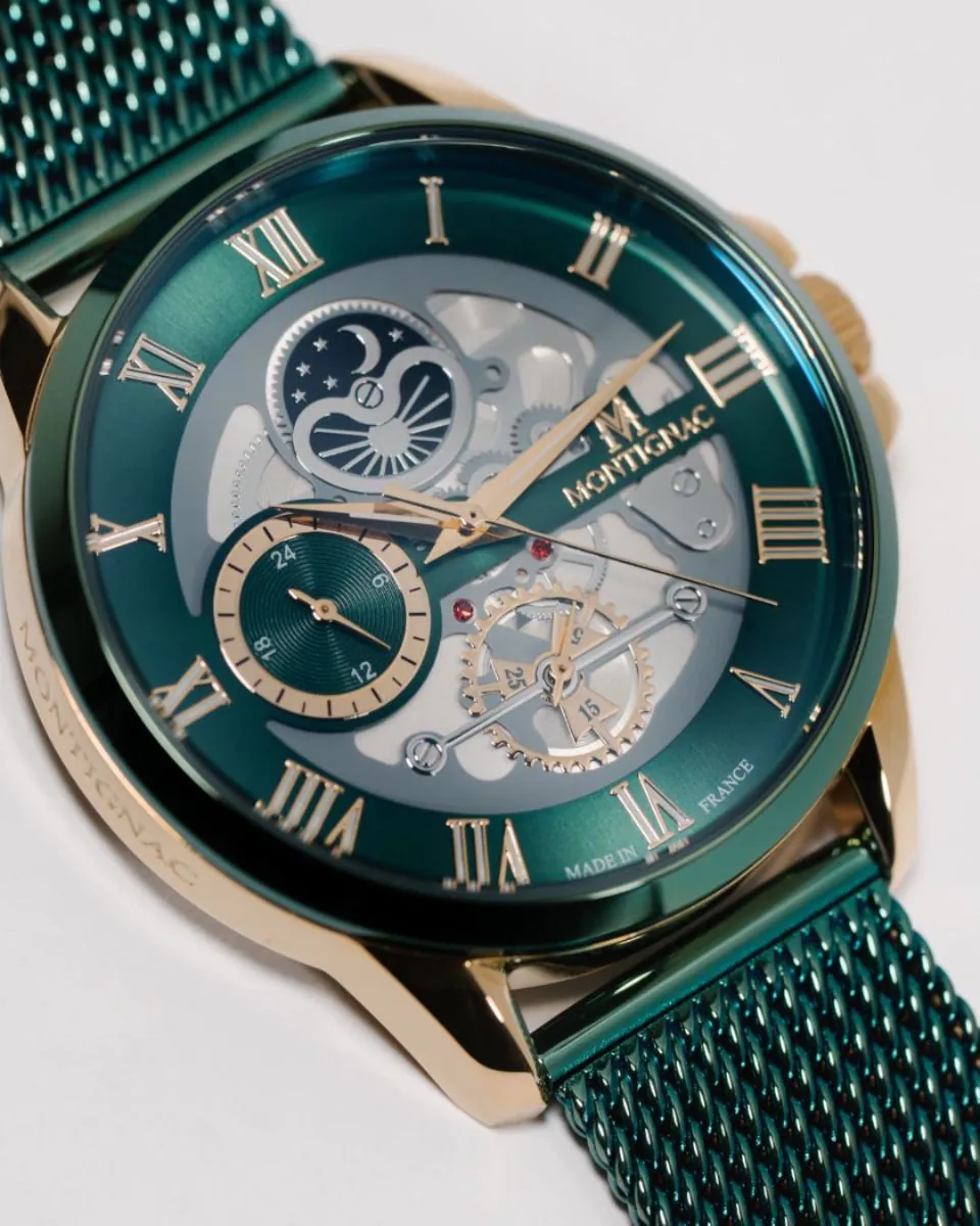Σχεδιασμένο και συναρμολογημένο στη Γαλλία. Αυτό το μοναδικό δημιούργημα του Montignac συνδυάζει τα καλύτερα της δεκαετίας του 1970. Μπρασελέ από πλέγμα του Μιλάνου, σύγχρονη αισθητική, σκελετός του καντράν και ιαπωνικός μηχανισμός quartz, προσφέροντας τέλεια ακρίβεια. Διαθέσιμο σε μια αποκλειστική απόχρωση viridity green, αυτό το ρολόι αποπνέει έναν έντονα μοντέρνο χαρακτήρα.